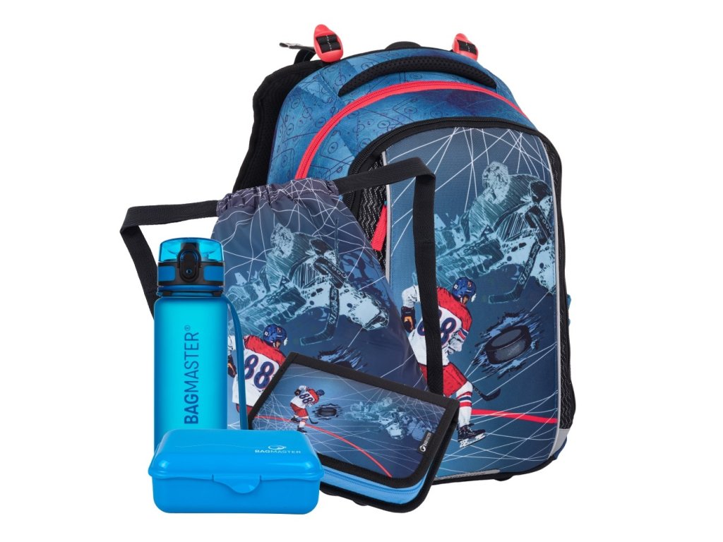 Set s hokejovým motivem pro malé školáky od 1. do 3. třídy. Školní batoh je navržen s ohledem na drobné postavy školáků. Přesto je batoh prostorný, uvnitř jsou dvě komory. Hlavní komora pojme velké desky a učebnice, díky kompresní kapse s elastickými pásy zůstanou těžké pomůcky blízko zad. Správnému držení těla pomáhají také ergonomicky tvarovaná záda a bederní pás. Batoh s motivem ledního hokeje stojí na plastových nožkách a je opatřen reflexními prvky.