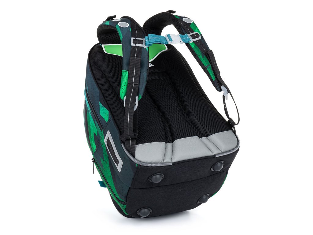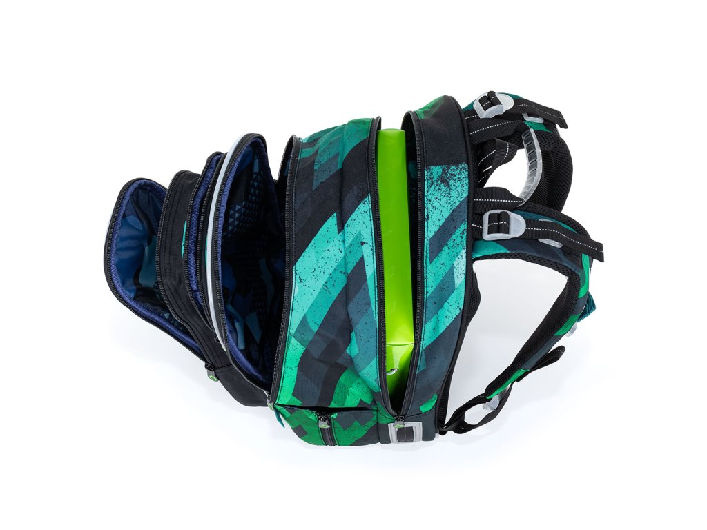 Zelenomodrý dvoukomorový batoh může nosit každý školák s výškou nad 125 cm.