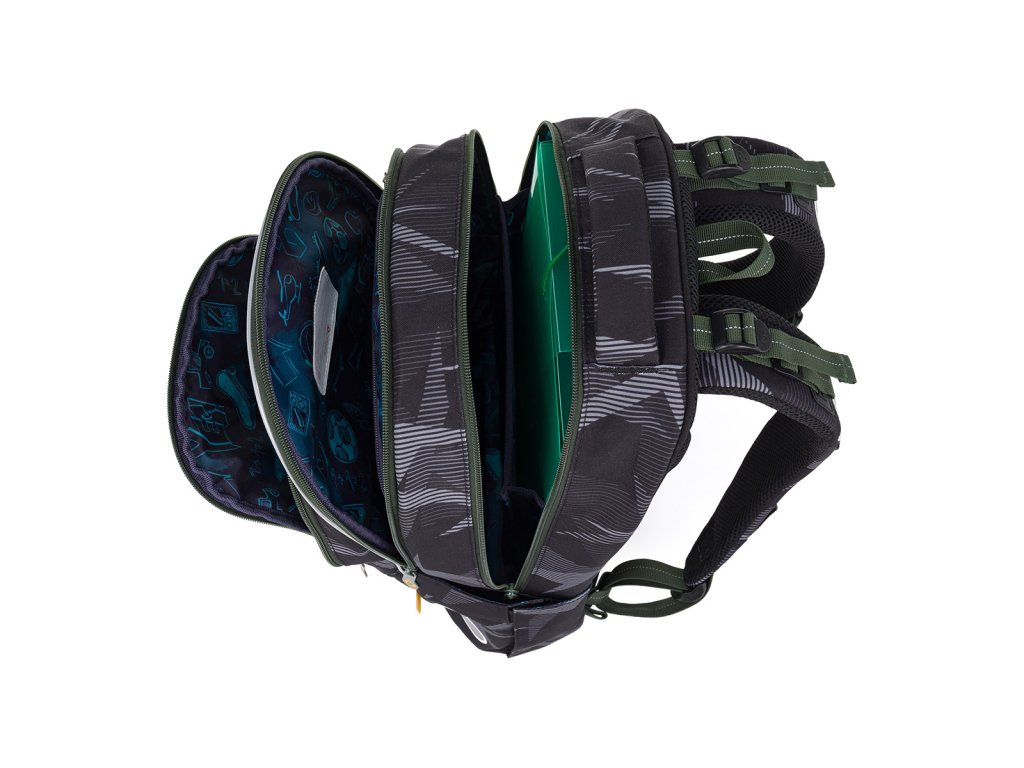 V zadní komoře najdete praktický organizér na učebnice a sešity. Do přední komory jsme umístili síťovanou kapsu na zip a jmenovku. Tato komora je jako stvořená pro krabičku na svačinu nebo pouzdro ve stejném designu.