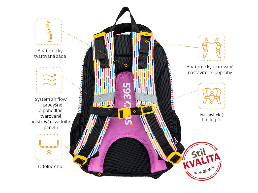 🎀 Školní batoh Stil Prime Candy je skvělou volbou pro holky, které chtějí lehký školní batoh, pohodlné nošení, praktické členění a veselý design. Hodí se pro každodenní školní dobrodružství od 1. do 4. třídy.