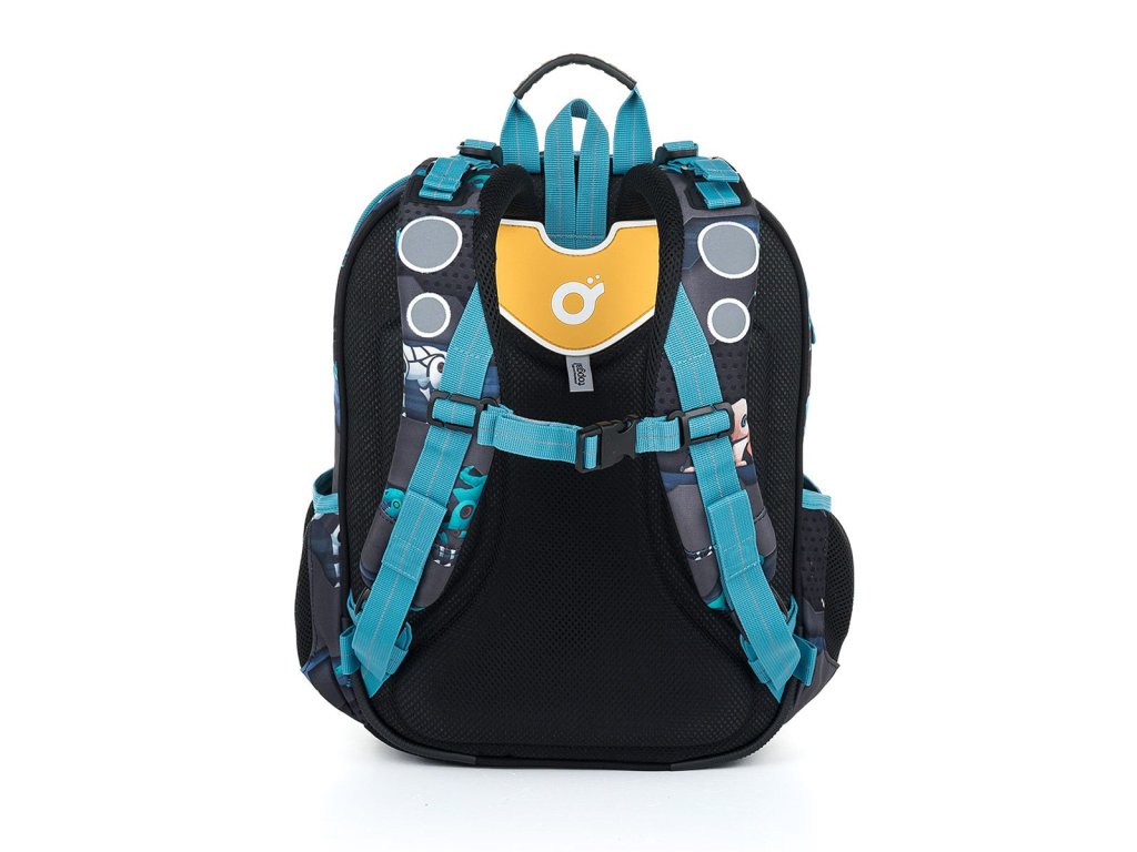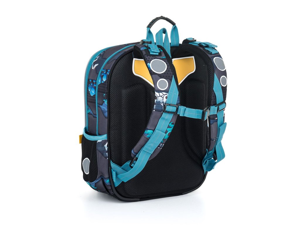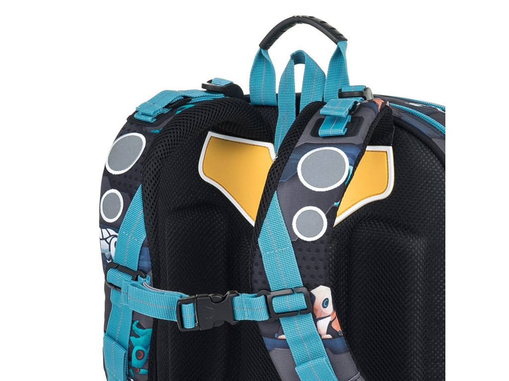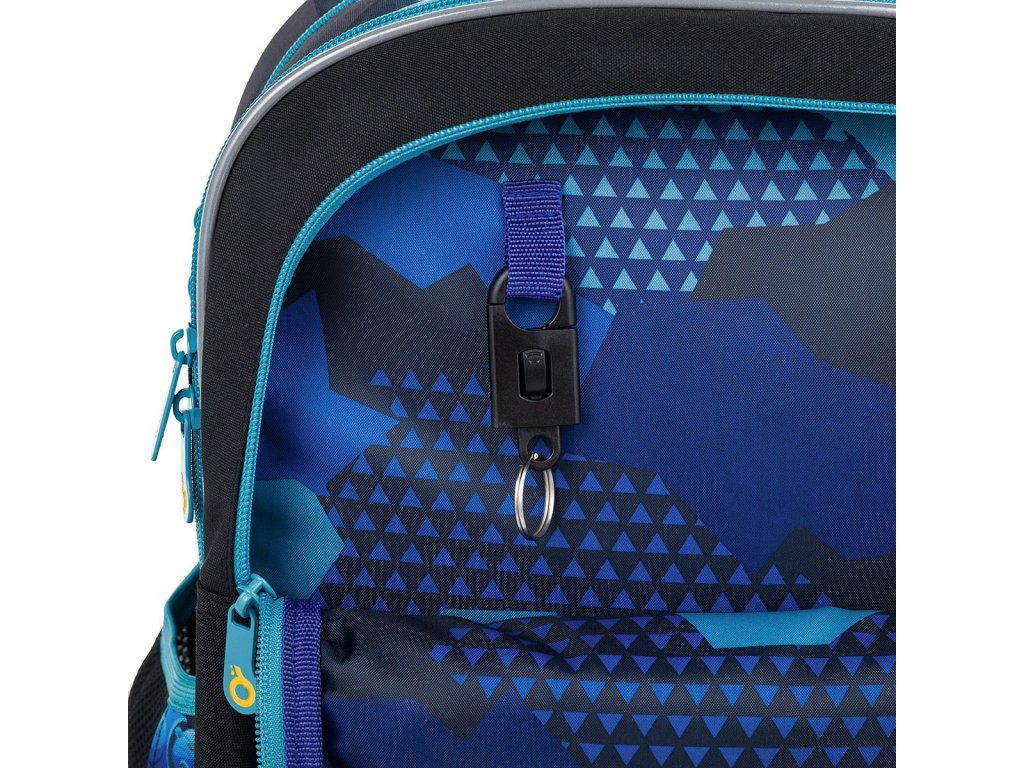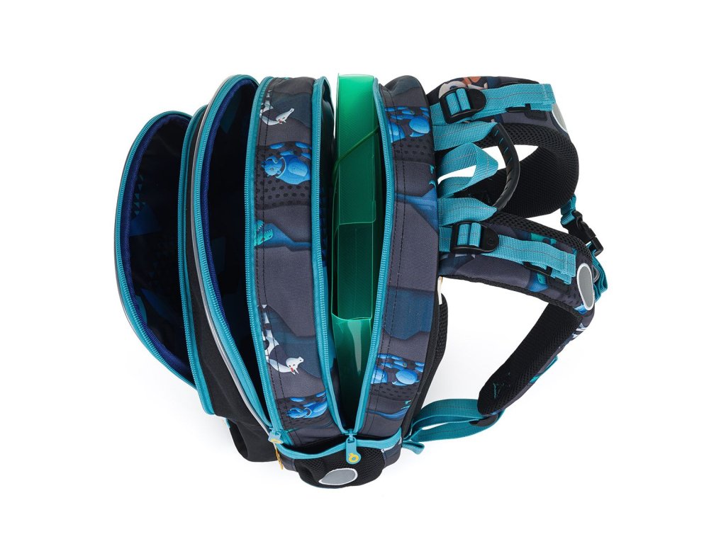 Batoh má dvě hlavní objemné komory. Zadní komora batohu je širší, proto do ní vložte nejtěžší učivo a směrem dopředu odlehčujte. V prostřední komoře je umístěna síťová kapsa na zip a jmenovka.