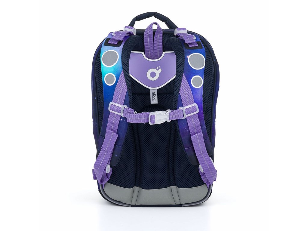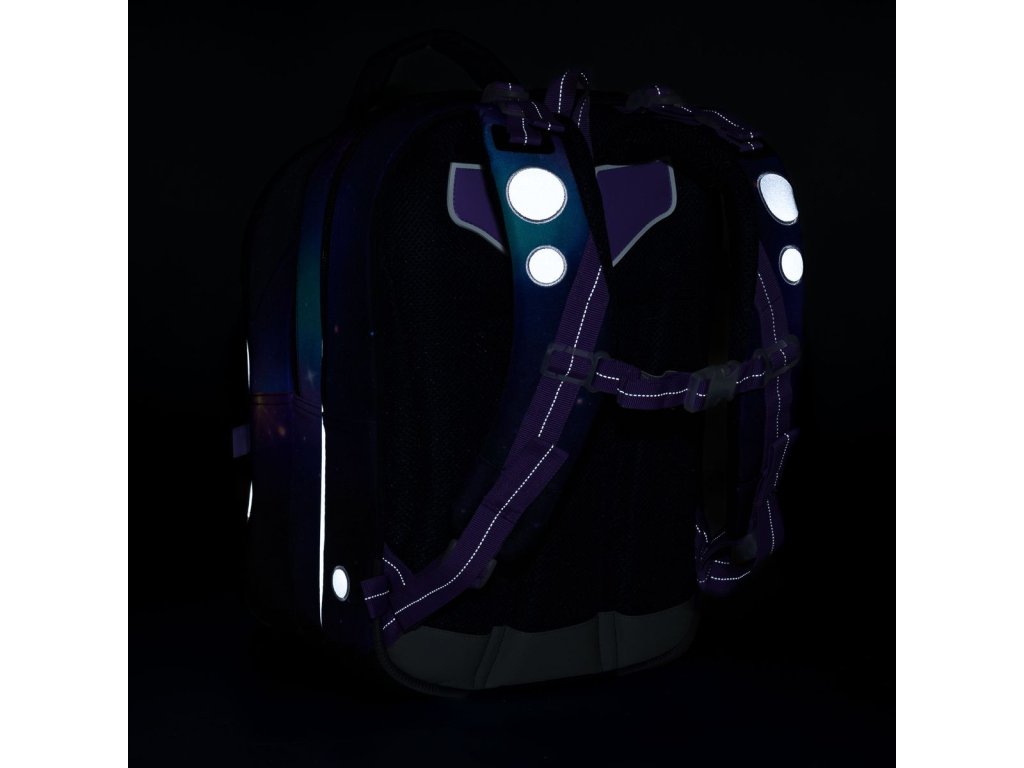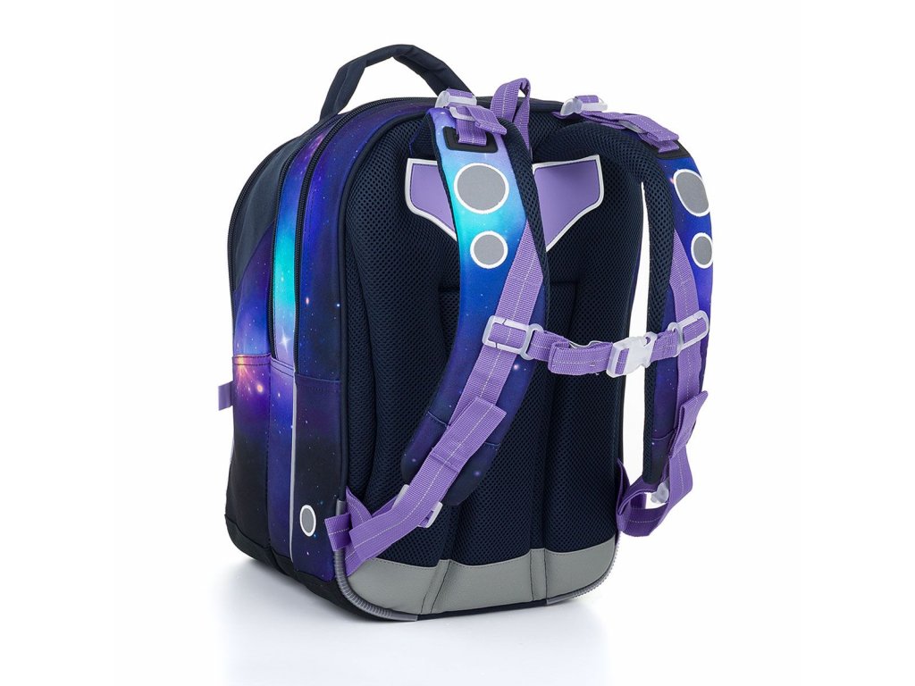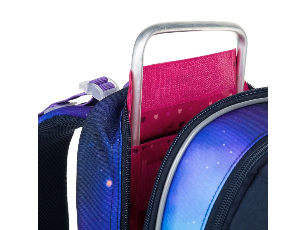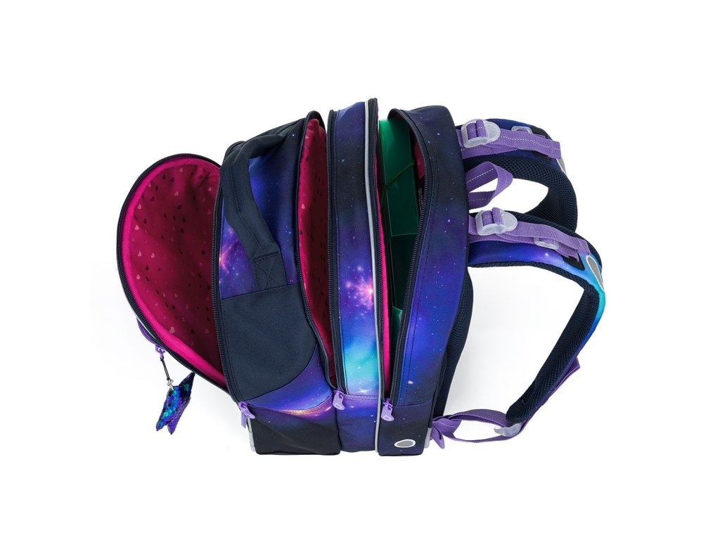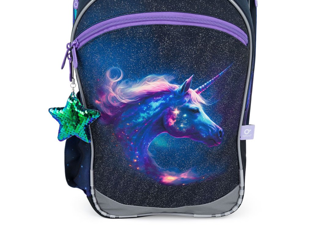 Topgal COCO 24006 v tmavomodré barvě a s motivem vesmírného jednorožce je určený pro všechny malé školačky od 1. do 5. třídy ZŠ s výškou od 120 cm. Tříkomorový střih je praktický a přehledný – ideální pro každodenní školní dobrodružství.