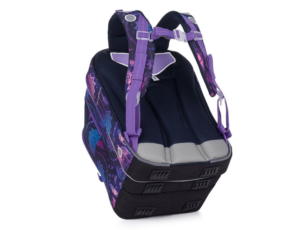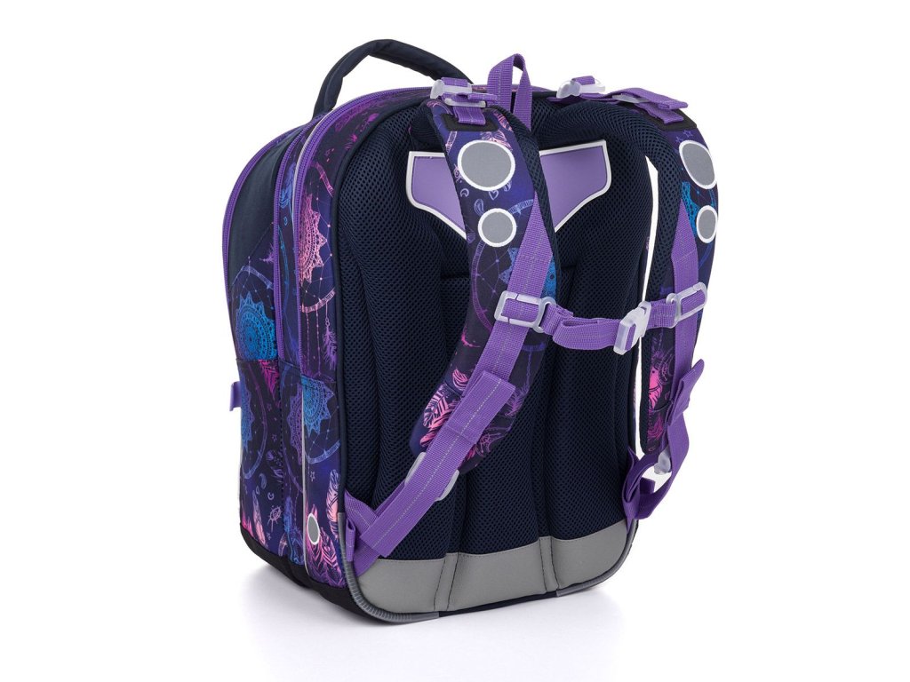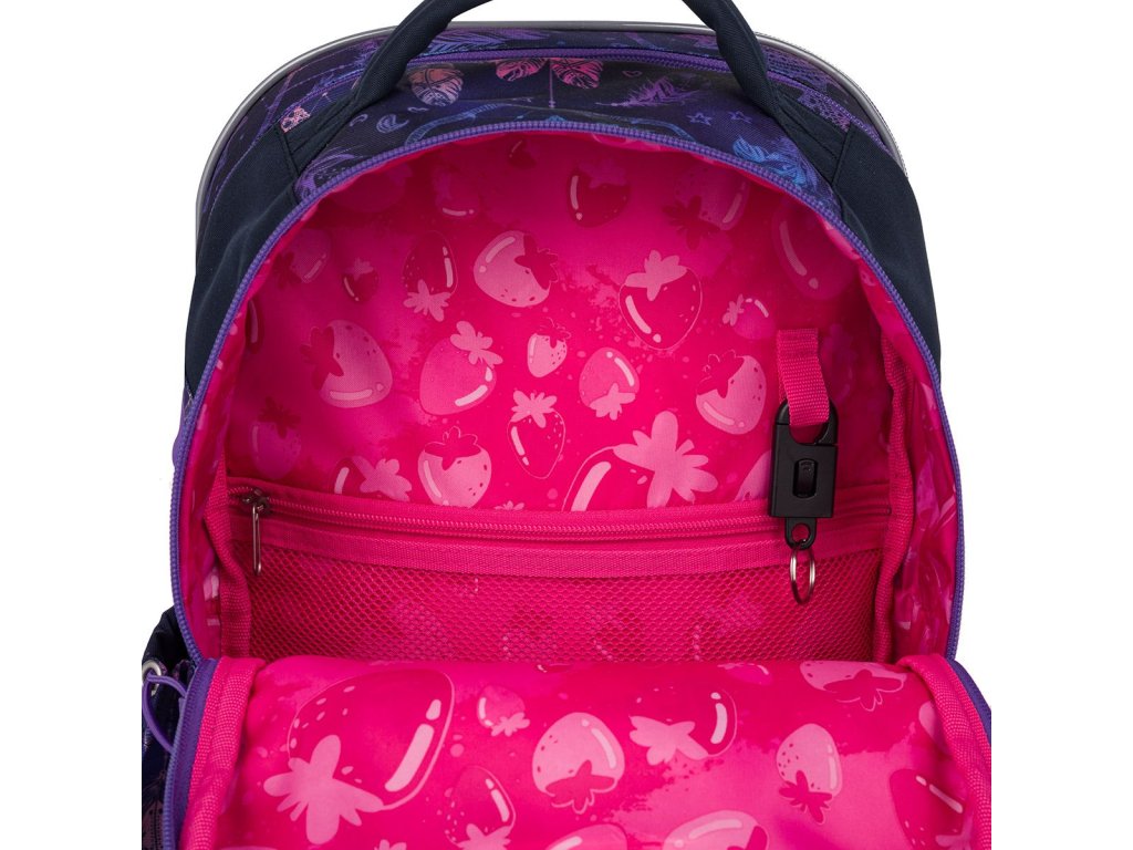 Do zadní komory radíme ukládat desky na sešity nebo nejtěžší učebnice, do prostřední komory pak další učivo těžší váhy. Přední komora je nejširší a navíc v ní najdete i kapsičku na zip a odnímatelnou karabinku na klíče.