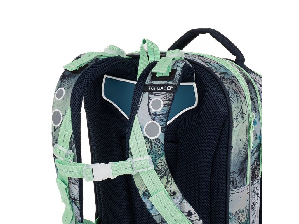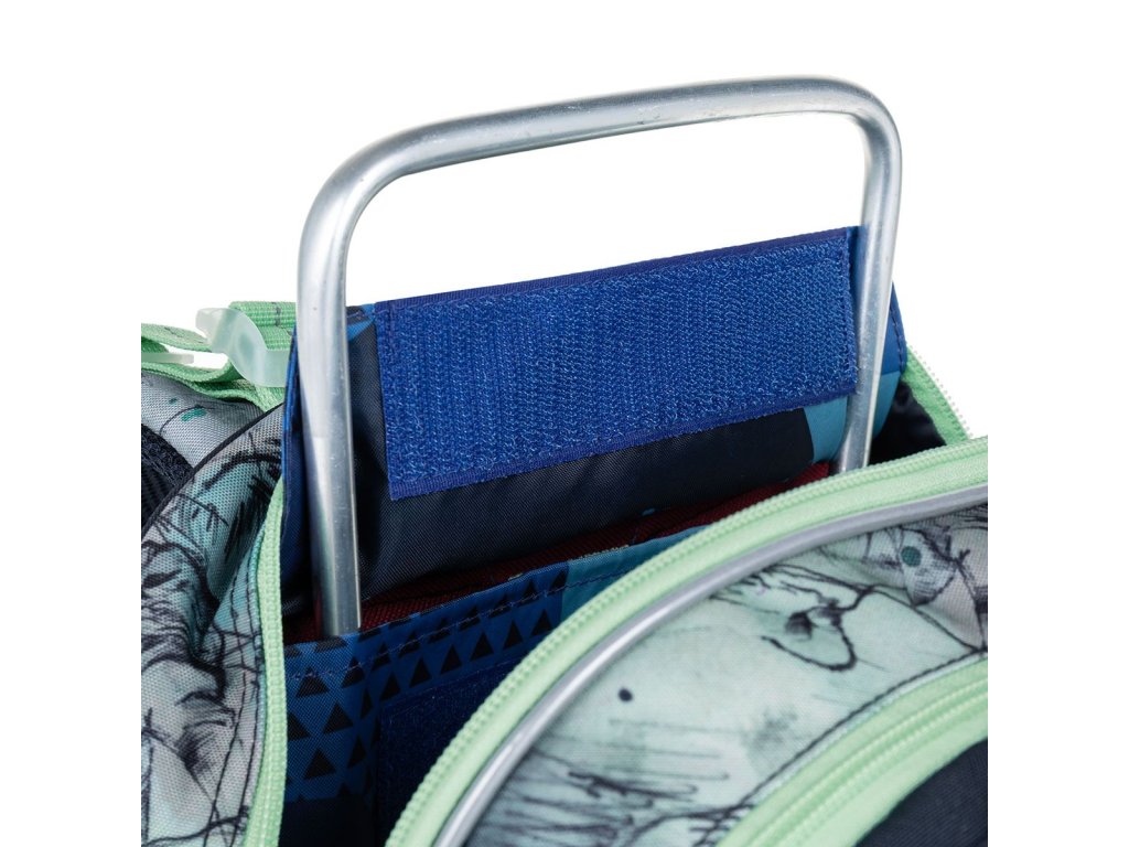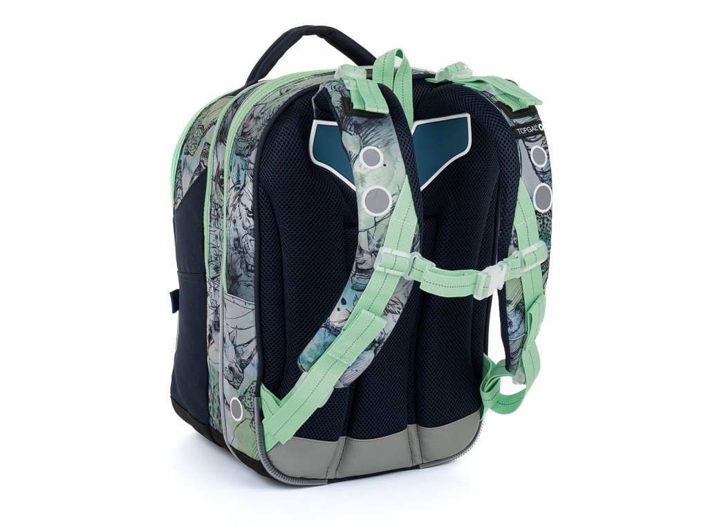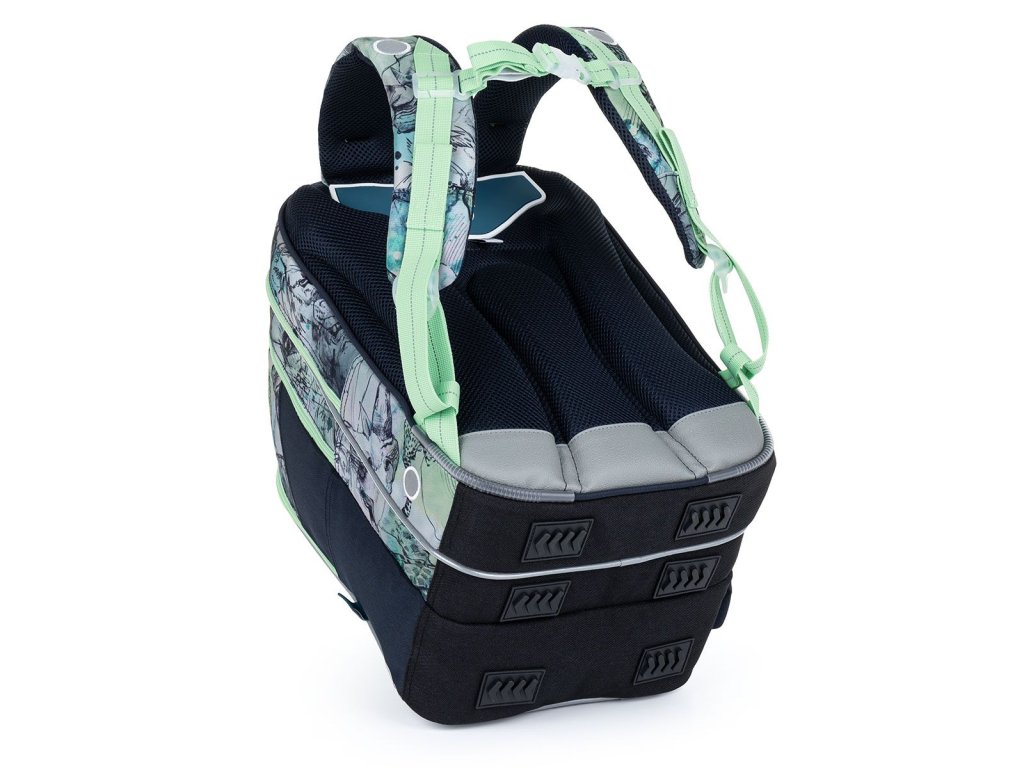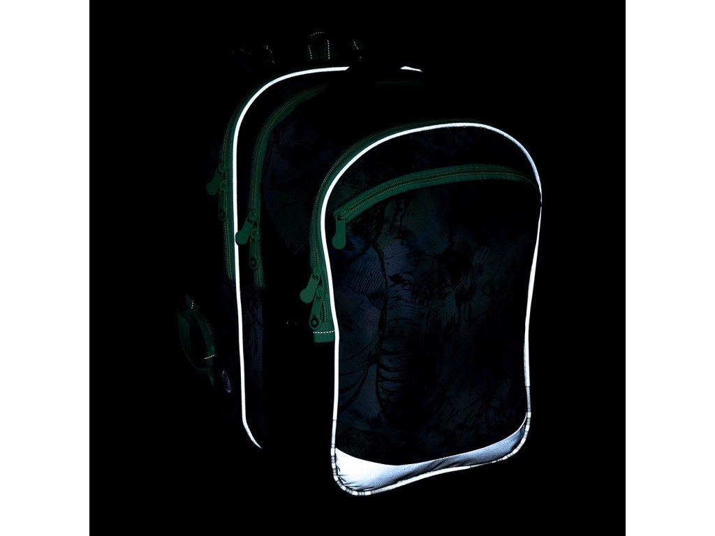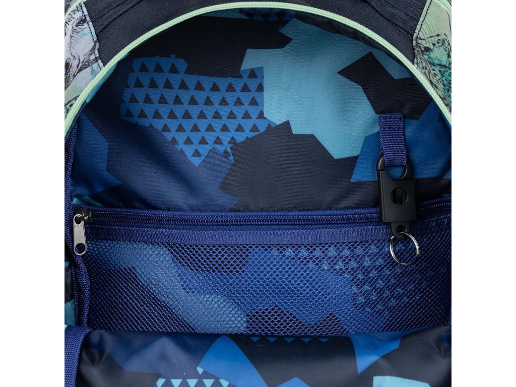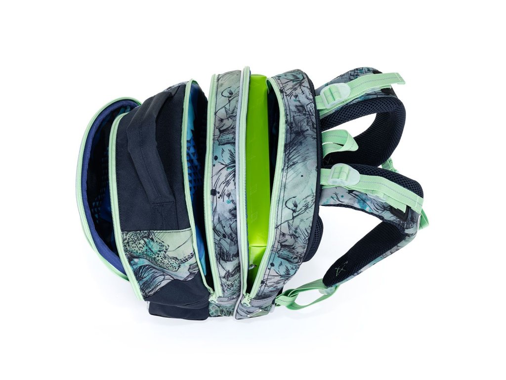 Batoh má tři objemné komory. Do nejširší kapsy doporučujeme dávat nejtěžší učebnice nebo desky na sešity. Přední komora je o něco užší a je v ní ještě malá síťová kapsa na zip a jmenovka.