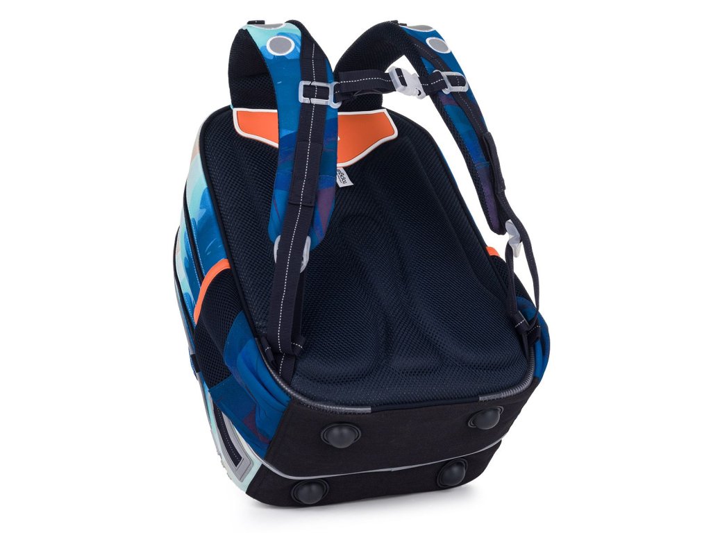Lisovaná zádová část batohu je anatomicky tvarovaná. Spolu s ergonomicky tvarovanými hrudními popruhy, které se dají utáhnout v horní i spodní části, zajistí správné nošení na zádech školáka i při denním nákladu několika kilo učení. Navíc jsme do konců popruhů všili magnet, díky kterému je můžete upevnit k tělu popruhu tak, aby volně nevlály kolem těla školáka. Výškově nastavitelný hrudní pásek pak zaručí, že nebudou ramenní popruhy sjíždět ze zad ani drobnému prvňáčkovi.