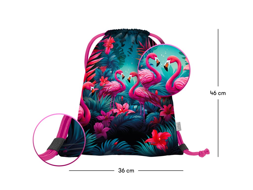Výhodný školní set zahrnující aktovku Ergo s romantickým motivem růžových plameňáků, penál a praktický sáček na tělocvik.