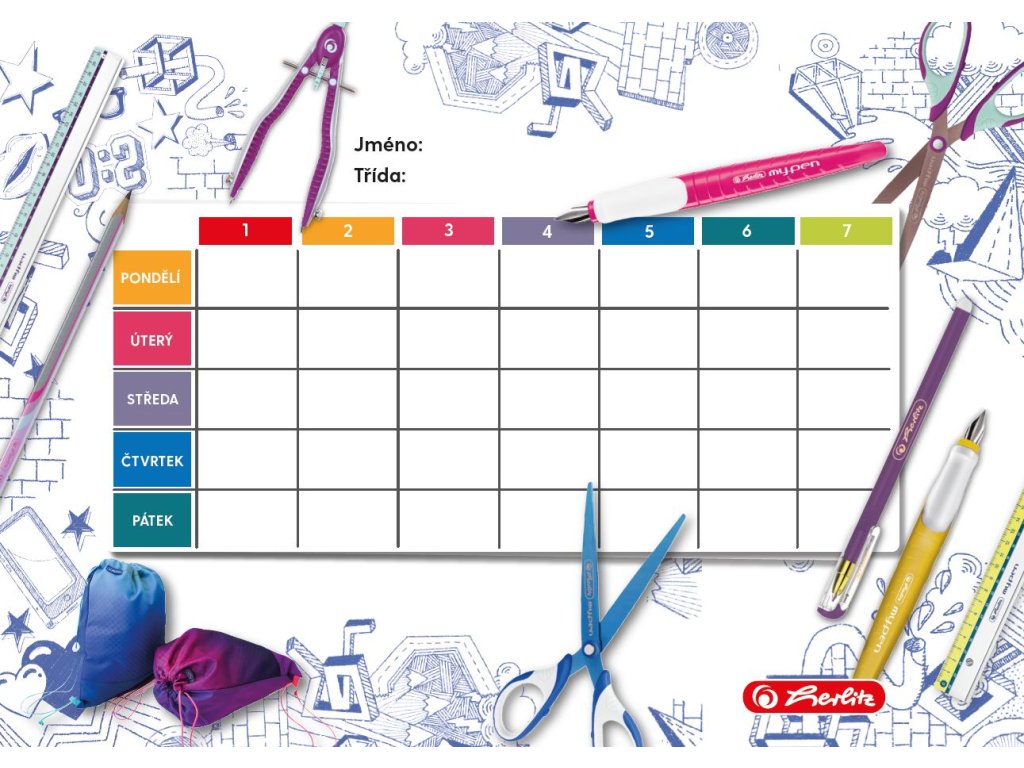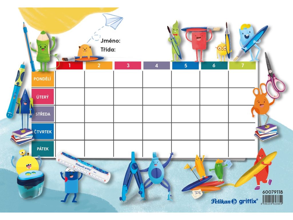 dny od pondělí do pátku, až 7 vyučovacích hodin, motiv Pelikan griffix a školní potřeby herlitz, papír 200 g/m2