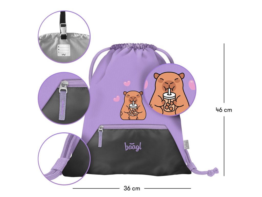 🦫 Sáček s kapsou Baagl Kapybara je univerzální školní a volnočasový doplněk, který využijí školáci každý den. Hodí se nejen na přezůvky nebo tělocvik, ale také na kroužky, sport, výlety nebo do města. Díky kapsičce na zip a možnosti připnutí k batohu je velmi praktický.