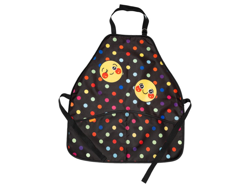 Hlavní část zástěrky je potištěna obrázky ve školních designech, ladících ke školní kolekci.