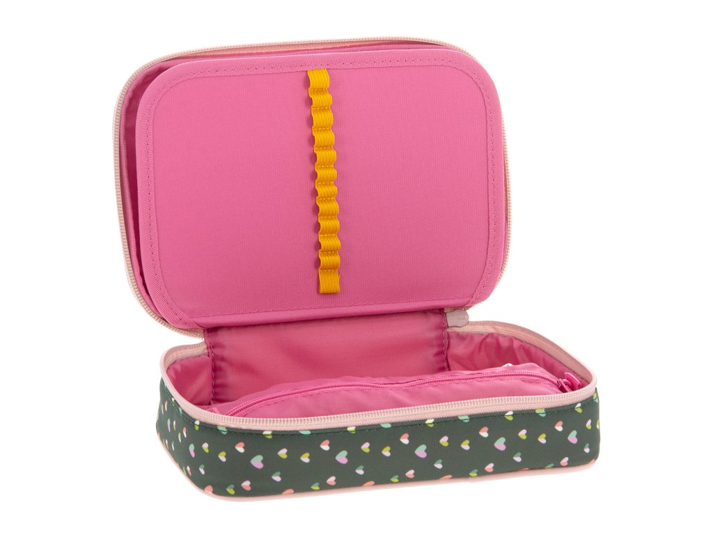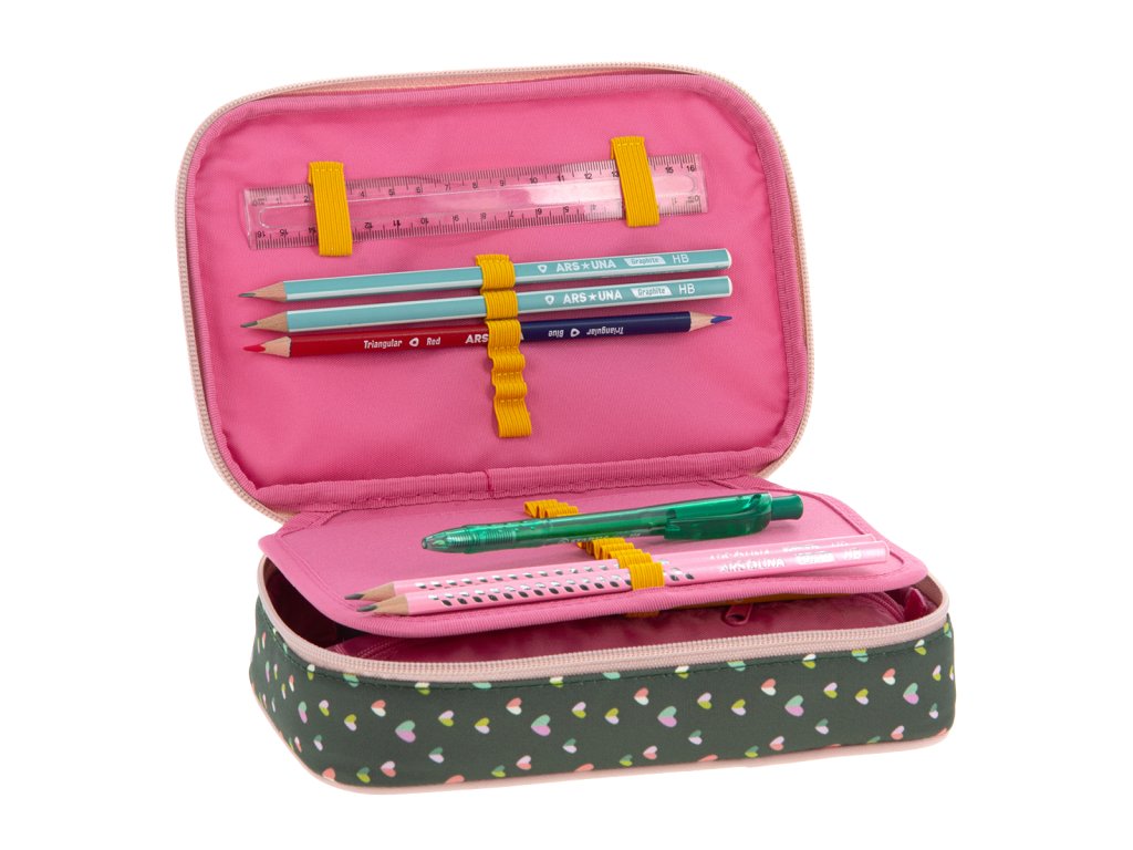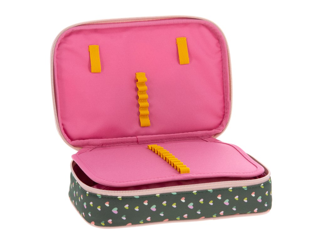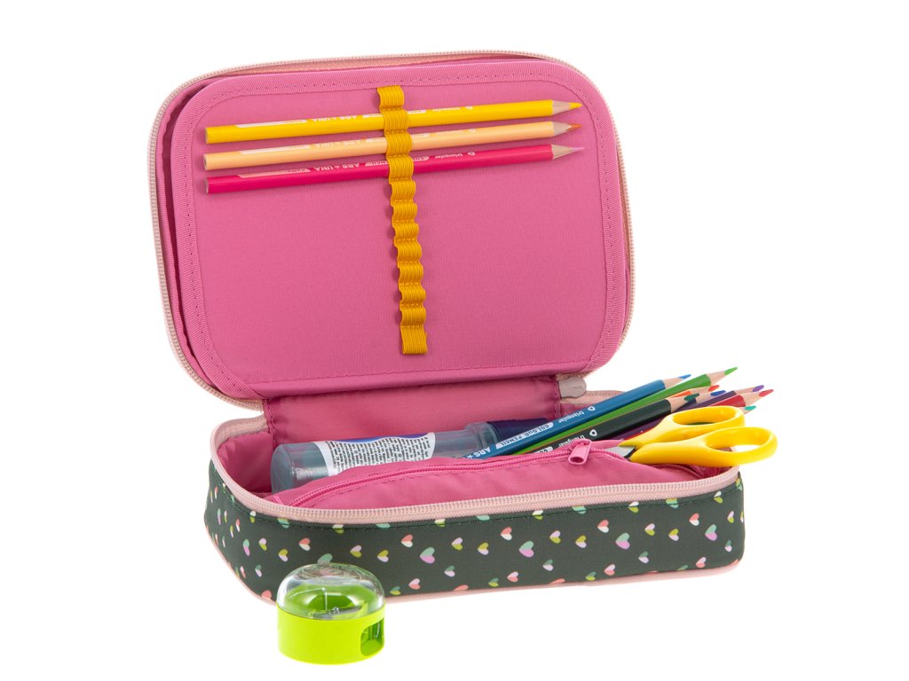 Uvnitř pouzdra se nachází dvě patra. V první komoře se nachází gumičky na pravítko a poutka pro 18 pastelek. V druhé komoře naleznete 12 poutek na fixy, pastelky, tužky či propisky na jedné straně a na opačné kapsičku na zip společně s gumičkami na ořezávátko a mazací gumu.