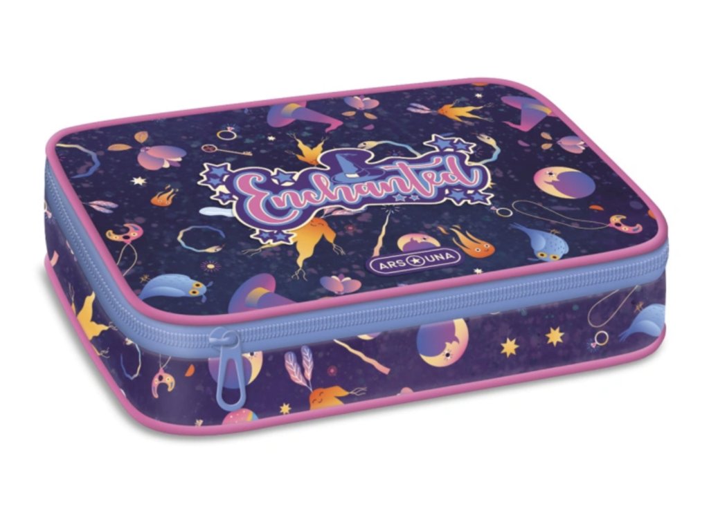 Prostorný školní penál z kolekce Enchanted od výrobce Ars Una s jednou zipovou kapsou a rozměrným úložným prostorem uvnitř. Pouzdro se uzavírá pomocí zipu s kovovým poutkem pro lepší manipulaci.