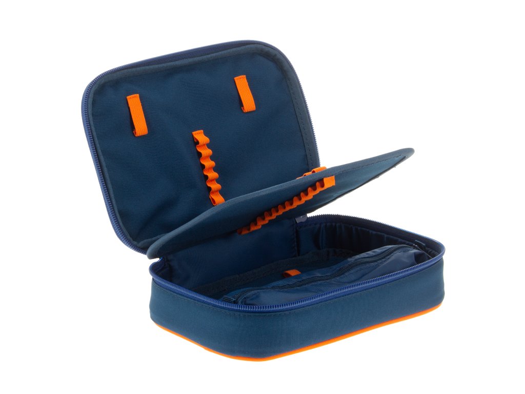 Uvnitř pouzdra se nachází dvě patra. V první komoře se nachází gumičky na pravítko a poutka pro 18 pastelek. V druhé komoře naleznete 12 poutek na fixy, pastelky, tužky či propisky na jedné straně a na opačné kapsičku na zip společně s gumičkami na ořezávátko a mazací gumu.