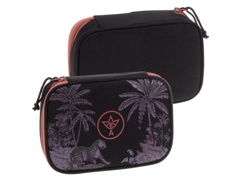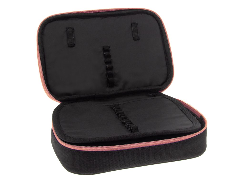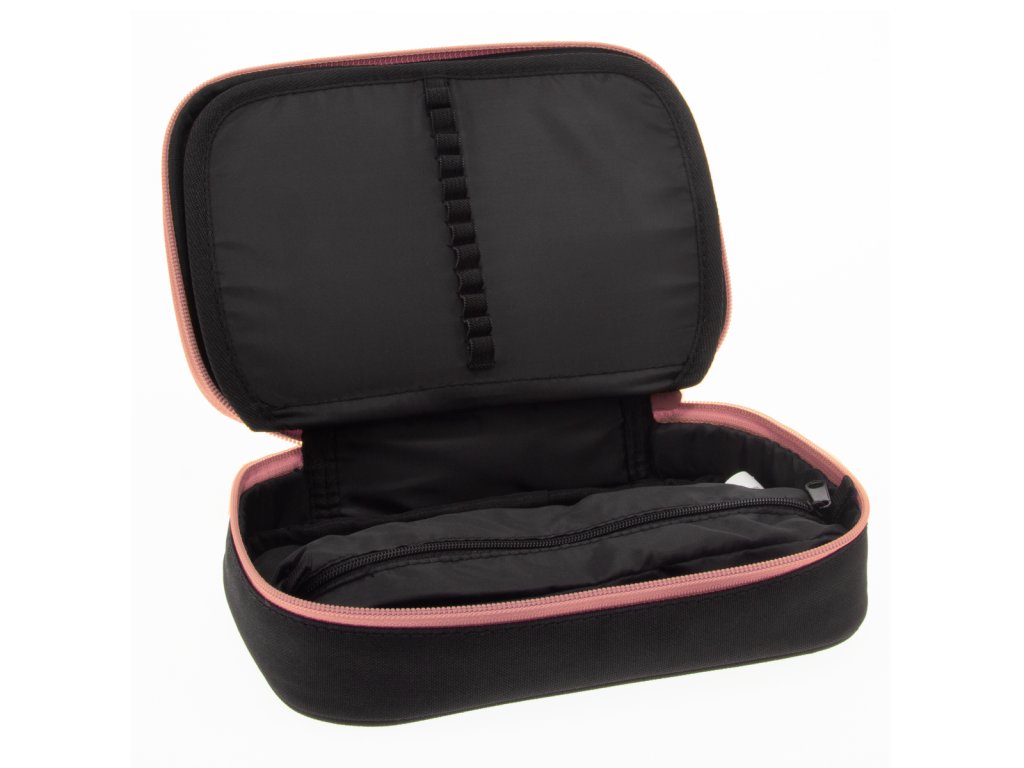 Uvnitř pouzdra se nachází dvě patra. V první komoře se nachází gumičky na pravítko a poutka pro 18 pastelek. V druhé komoře naleznete 12 gumiček na fixy, pastelky, tužky či propisky na jedné straně a na opačné kapsičku na zip společně s gumičkami na ořezávátko a mazací gumu.