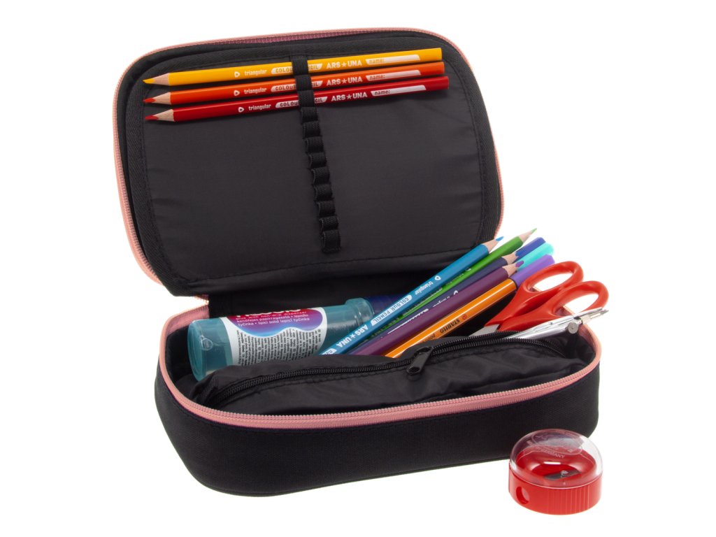 Prostorný školní penál od výrobce Ars Una s jednou zipovou kapsou a rozměrným úložným prostorem uvnitř. Pouzdro se uzavírá pomocí zipu s kovovým poutkem pro lepší manipulaci.
