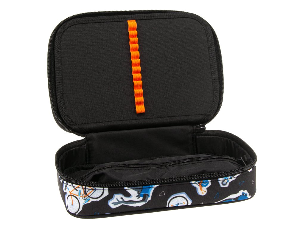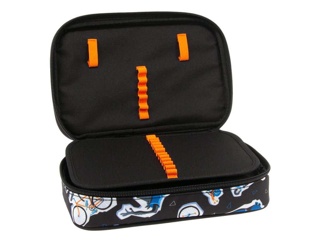 Uvnitř pouzdra se nachází dvě patra. V první komoře se nachází gumičky na pravítko a poutka pro 18 pastelek. V druhé komoře naleznete 12 poutek na fixy, pastelky, tužky či propisky na jedné straně a na opačné kapsičku na zip společně s gumičkami na ořezávátko a mazací gumu.