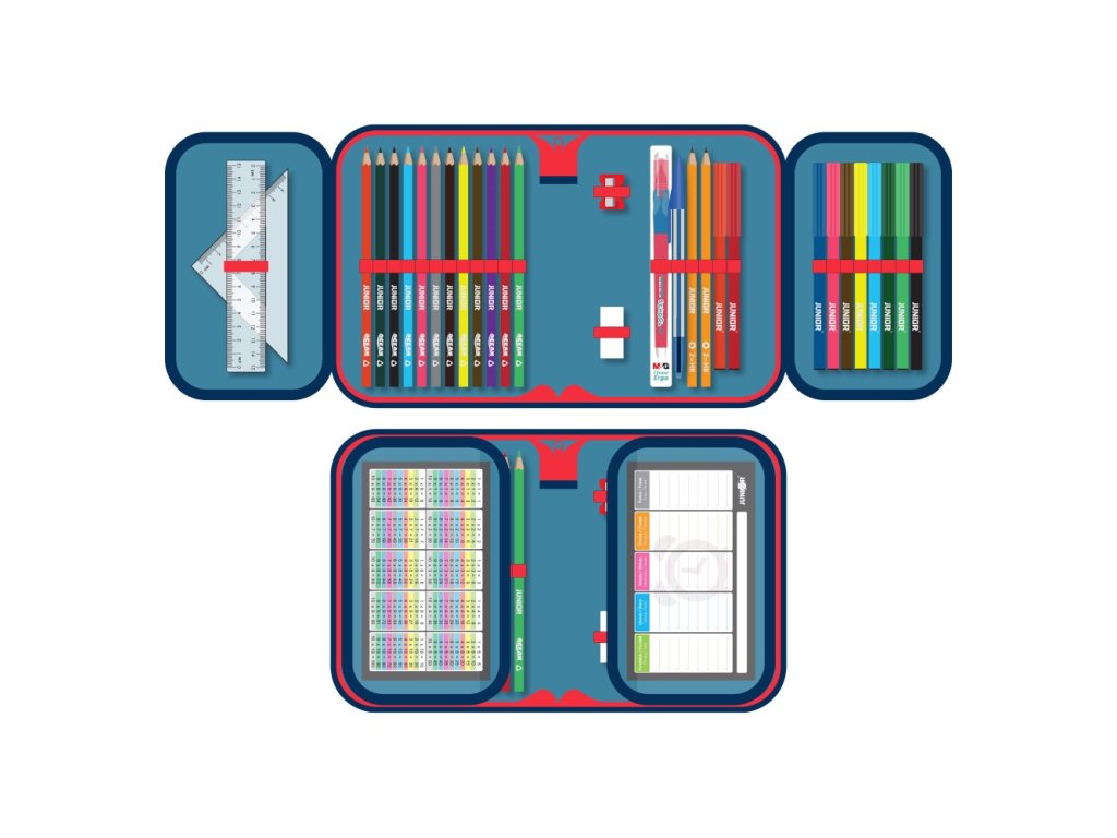 1× pravítko 15 cm • 1× trojúhelník 10 cm • 1× ořezávátko • 1× guma • 1× rozvrh hodin & malá násobilka • 1×kuličkové pero (modrá) • 2× grafitová tužka (trojúhelníkové tělo) • 10× fix s kónickou špičkou • 12× pastelka (trojúhelníkové tělo). -