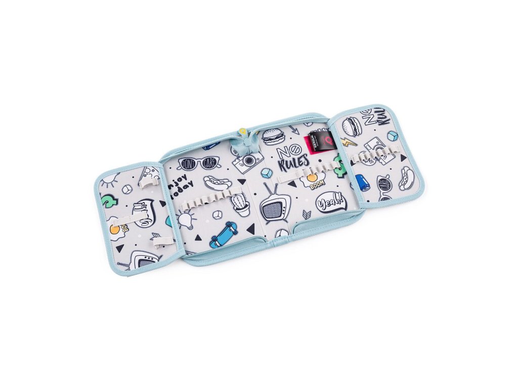 Vnitřní podšívka penálu je vyrobena z šedé látky s natištěnými obrázky, které si děti mohou vybarvit dle nálady a chuti.Doporučujeme k vybarvování použít klasické pastelky, fixy by se mohly rozpíjet.