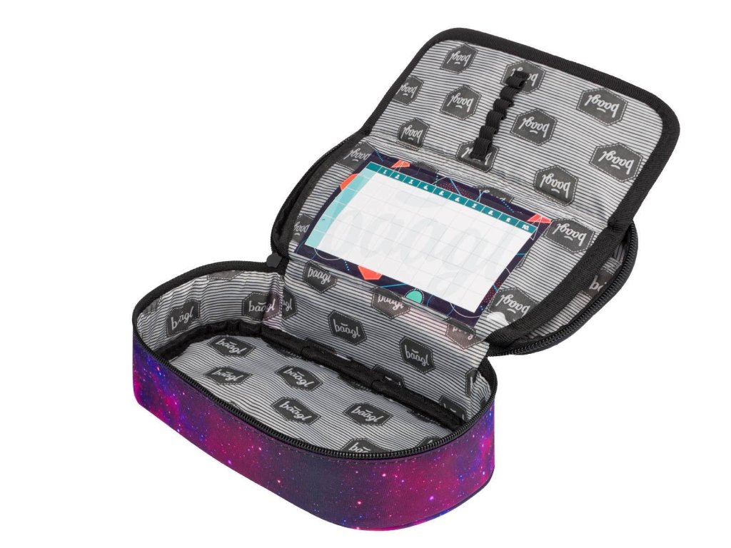 – 🖊️ Penál etue Galaxy: Prostorná komora, dvojitá výklopná chlopeň, vnitřní kapsa a okénko na rozvrh. Bez náplně – dítě si vybaví samo.