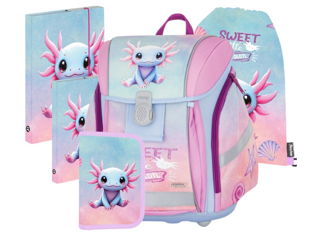Školní set Oxybag Premium Light Axolotl je ideální výbavou pro nástup do 1. třídy. Motiv oblíbeného axolotla v moderním designu zaujme děti a udělá ze školní výbavy originální doplněk.