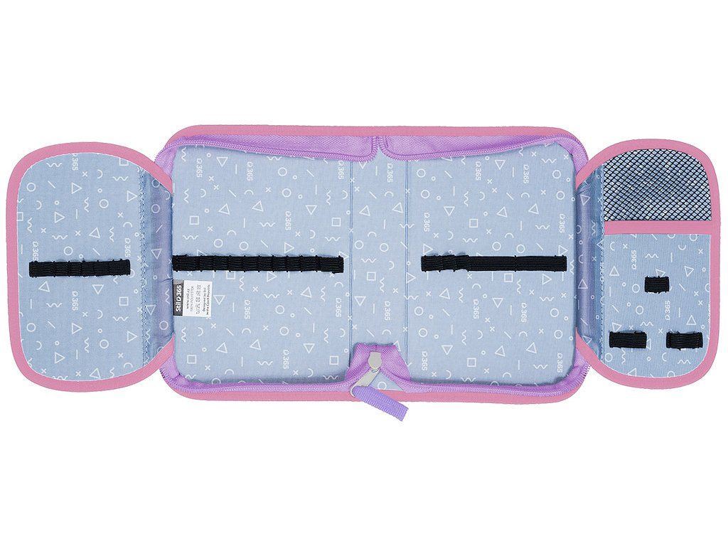 ✔️ jednopatrový penál – bez náplně, s 24 pevnými gumičkami, průhlednou kapsou na rozvrh a síťovanou kapsičkou na drobnosti