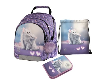 Dívčí školní set pro prvňáčka Kočky Ulitaa obsahuje ergonomický batoh, vak na záda a velký jednokomorový penál ve stejném designu.