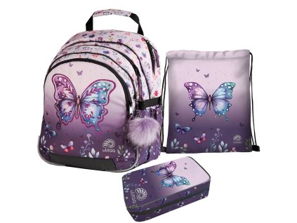 Dívčí školní set pro prvňáčka Motýl Ulitaa obsahuje ergonomický batoh, vak na záda a velký jednokomorový penál ve stejném designu.