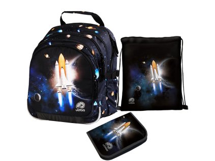Výhodný školní set pro prvňáčka s motivem vesmíru Ulitaa obsahuje ergonomický batoh, vak na přezůvky či tělocvik a praktický penál ve stejném designu.