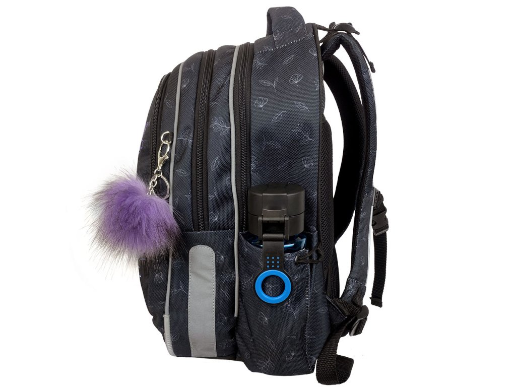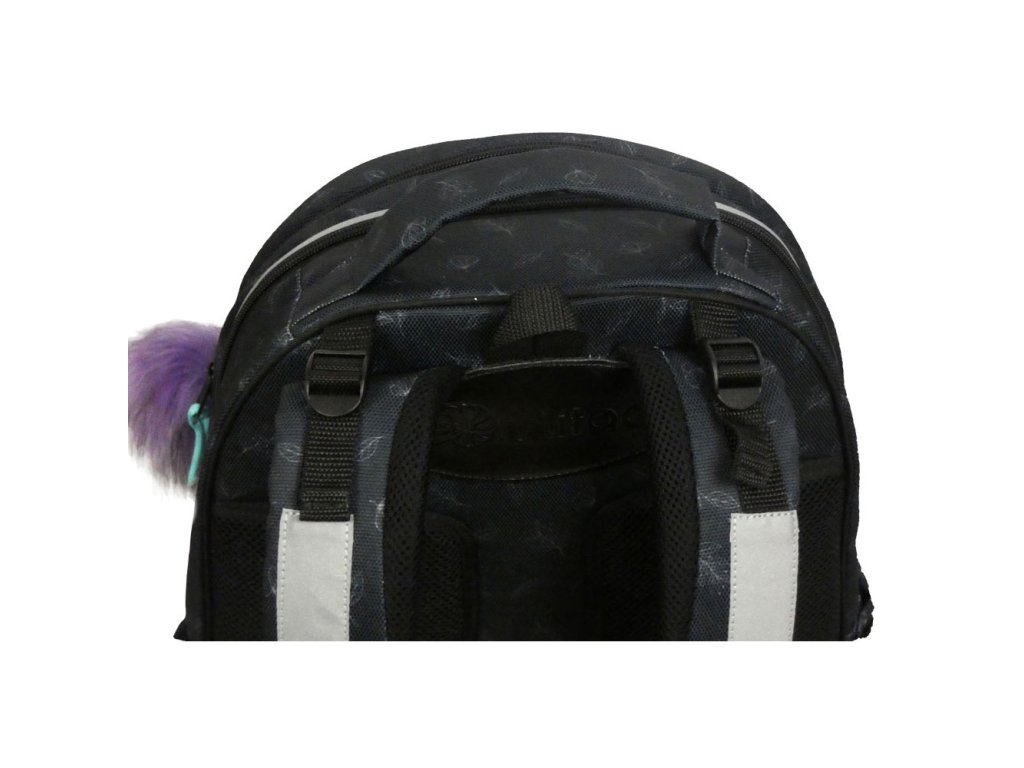 Reflexní prvky pro zvýšení viditelnosti a bezpečnosti najdete ze všech stran - z boku, na přední části i na ramenních popruzích. Velmi důležité jsou právě z bočních stran školní tašky, protože při přecházení silnice vidí řidič chodce právě z boku. Batoh do školy je možné připevnit na háček k lavici pomocí látkového poutka. V horní části je velké ucho k přenášení. Dále má boční poutko pro uchycení navijáku na čip, klíče nebo přívěšek. Součástí je fialový chlupatý designový přívěšek.
