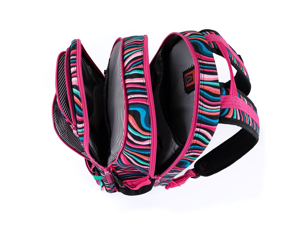 Střih YUMI je jedním z našich nejoblíbenějších. I proto jsme jej letos oblékli do barevného hravého designu s vlnkami. Záda batohu jsou pevná díky hliníkové výztuze, jsou ale měkce polstrovaná. Polstrované jsou i délkově nastavitelné, anatomicky tvarované ramenní popruhy s výškově nastavitelným hrudním páskem.