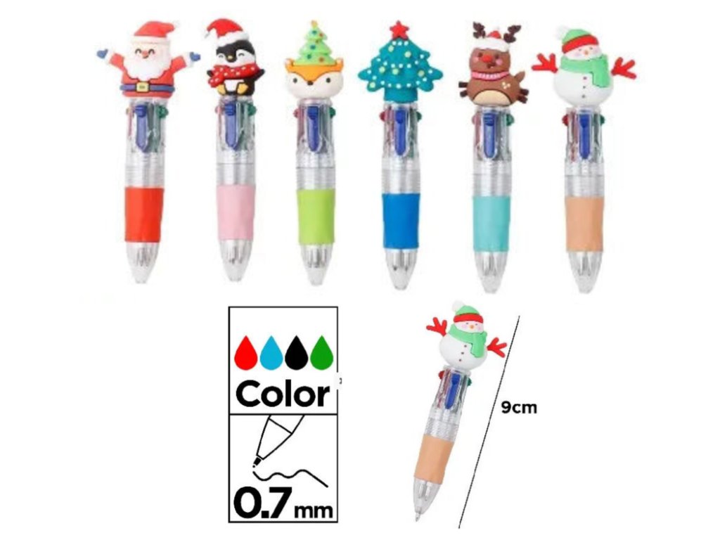 Tato vánoční propiska 4 barevná přináší čtyři inkousty v jedné elegantní tělísku — červený, modrý, černý a zelený — ideální pro psaní i kreslení. Hrot 0,7 mm umožňuje přesné linie i elegantní grafiku. Délka 9 cm zaručuje skvělé držení i pro děti.