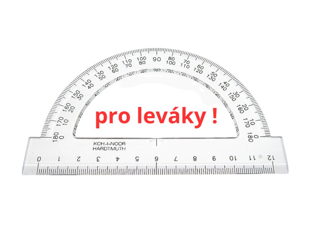 Tento školní úhloměr Koh-i-Noor je navržen tak, aby vyhovoval levákům při rýsování a měření úhlů. Stupnice je přizpůsobena pohodlnému čtení levou rukou.