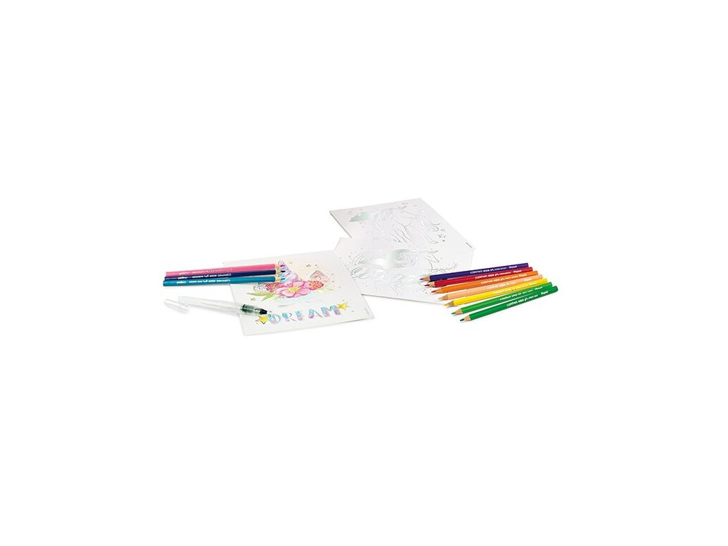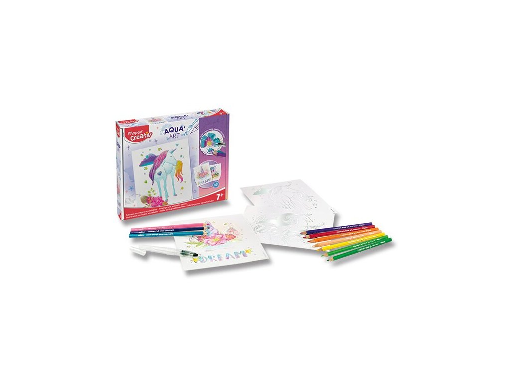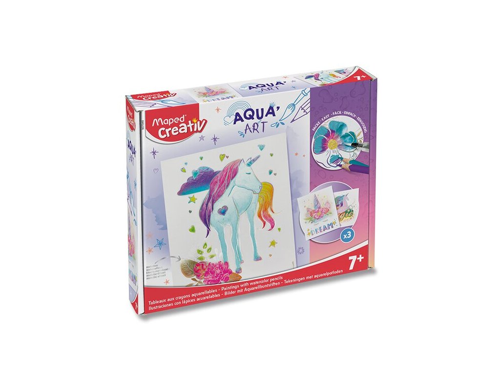 Kreativní sada Maped Creative Aqua´Art Unicorns je ideální pro tvorbu obrázků s „efektem akvarelu“. Metalizované obrázky k vybarvení a následné úpravě štětcem pro jedinečný „akvarelový efekt“. Metalické obrysy zabrání nechtěnému přetažení barvou.