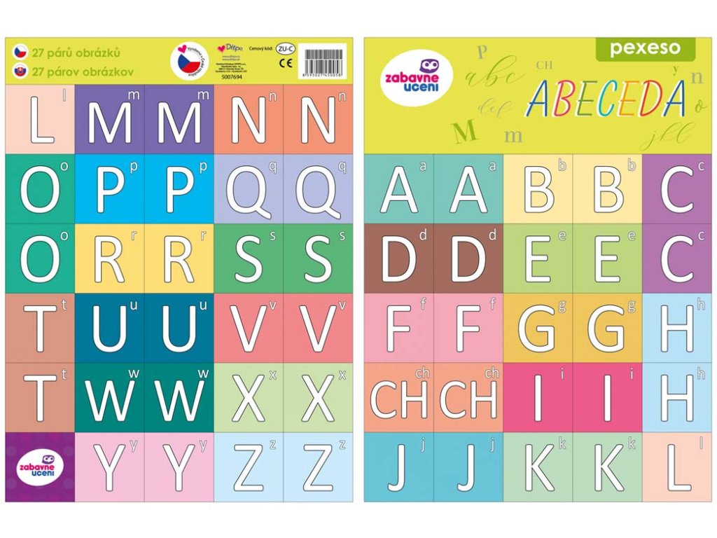 Během hry se děti učí rozeznávat tiskací písmena. Balení obsahuje 27 párů kartiček. Rozměr pexesa: 297 x 222 mm