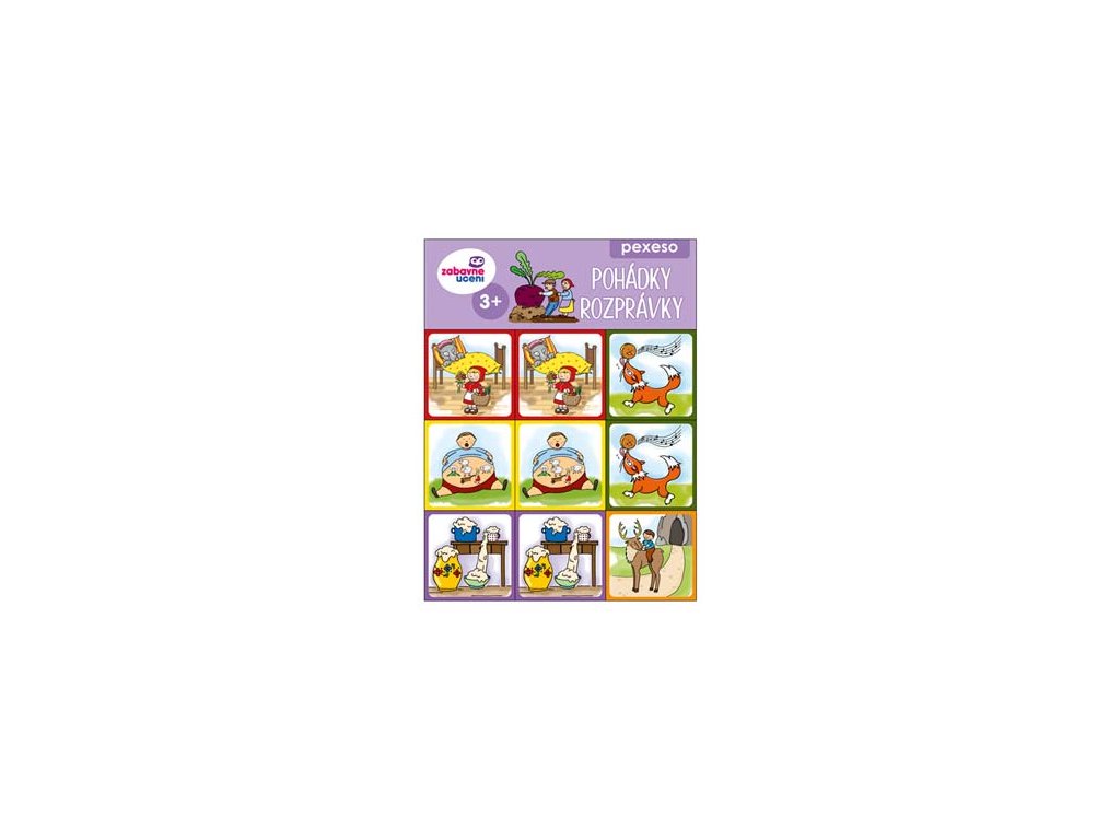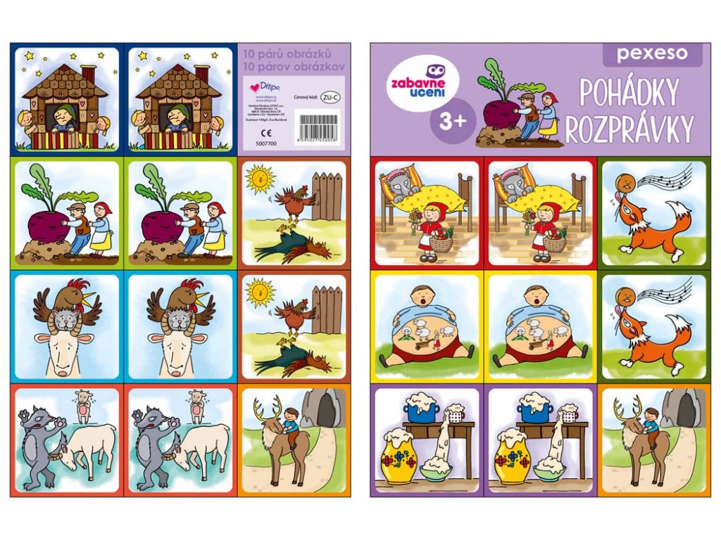 10 druhů těch nejznámnějších pohádek: Perníková chaloupka, O veliké řepě, Kohoutek a slepička, O zvířátkách a loupežnících, O třech kůzlátkách, O Smolíčkovi, Červená karkulka, Otesánek, Hrnečku vař, Koblížek na vandru. Pexeso obsahuje 10 párů kartiček, rozměr pexesa: 297 x 222 mm