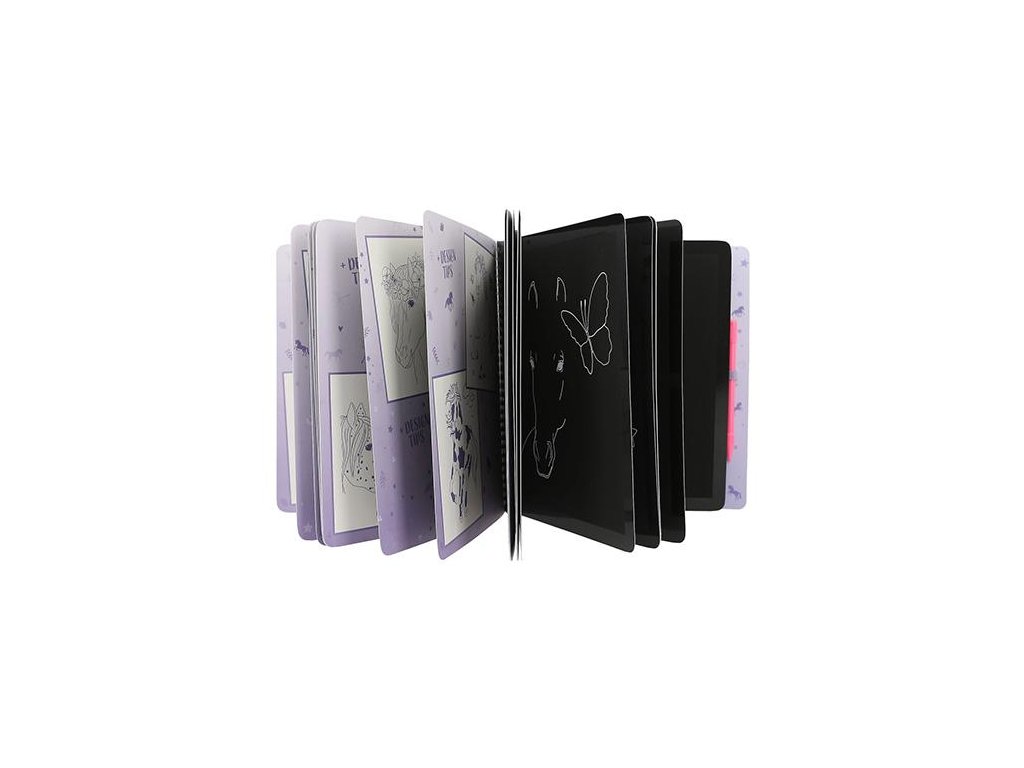 Na první pohled černé stránky v sobě skrývají duhové a třpytivé motivy, které děti odhalí pomocí přiloženého dřevěného pera. Každý tah přináší nové barevné vzory a okouzlující kresby z jezdeckého světa.