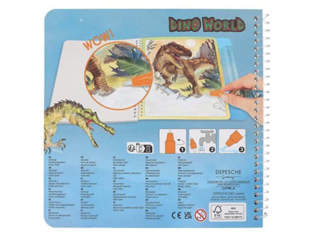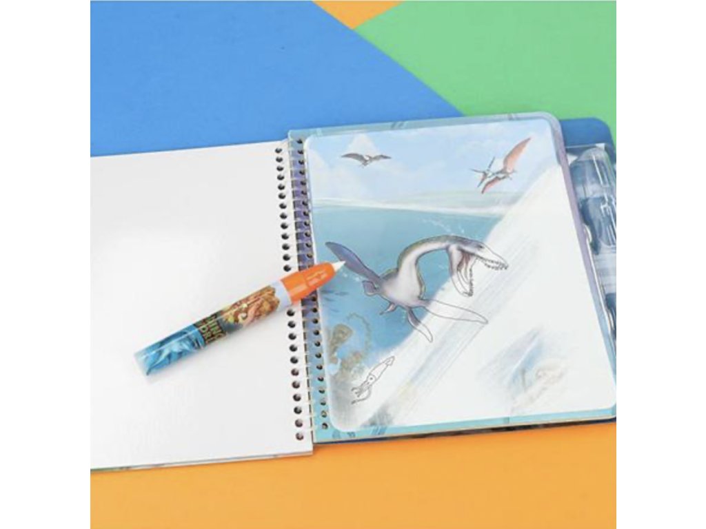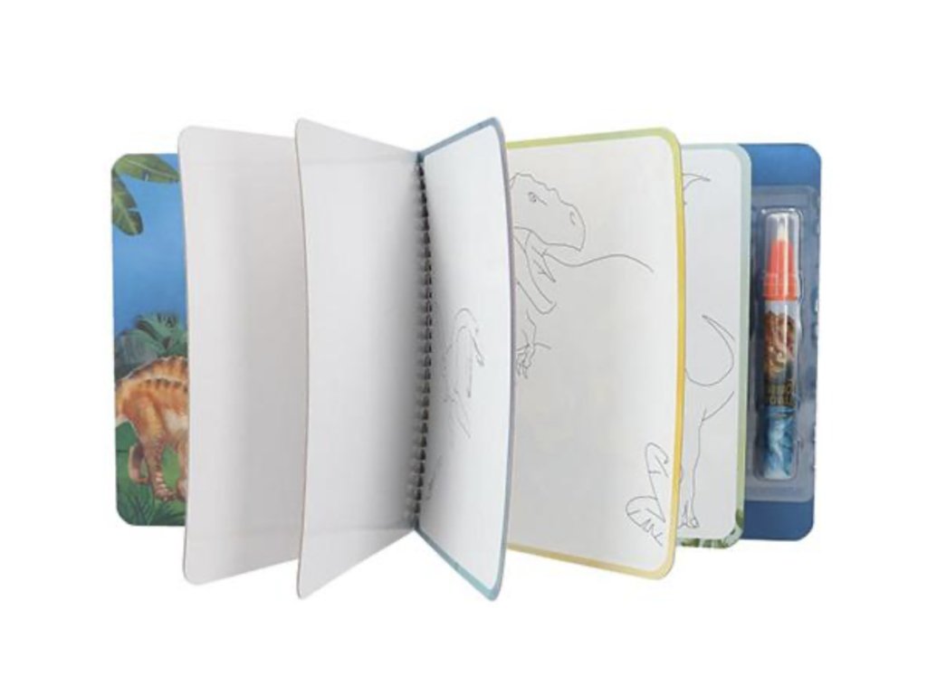 Omalovánky Dino World Aqua Magic promění malování v zábavu bez nepořádku. Naplň kouzelné pero vodou 💧 a přetři obrázek – barvy se hned objeví 🌈. Jakmile obrázek uschne, barvy zmizí a můžeš malovat znovu a znovu!