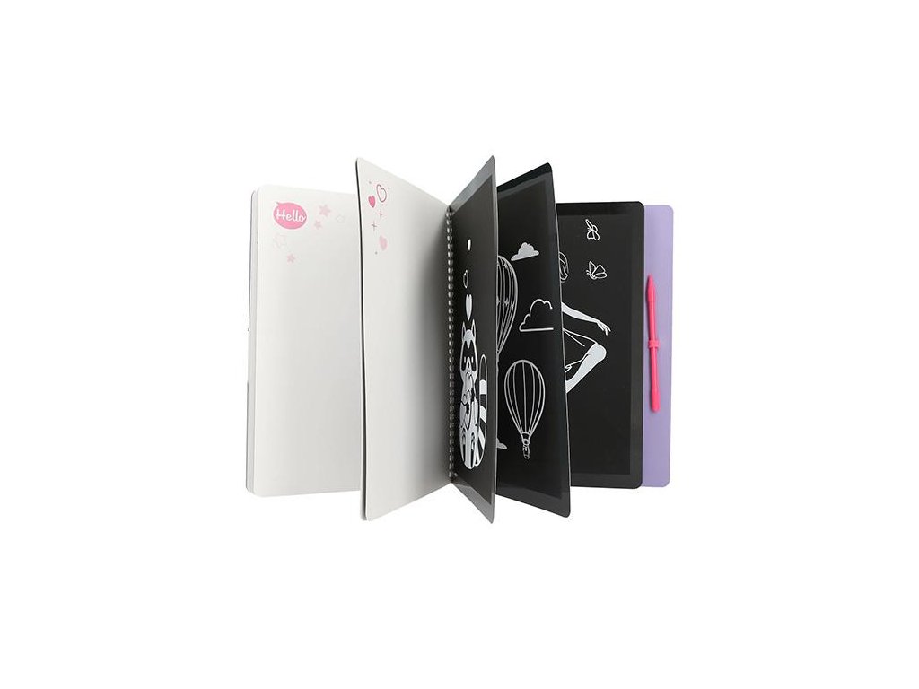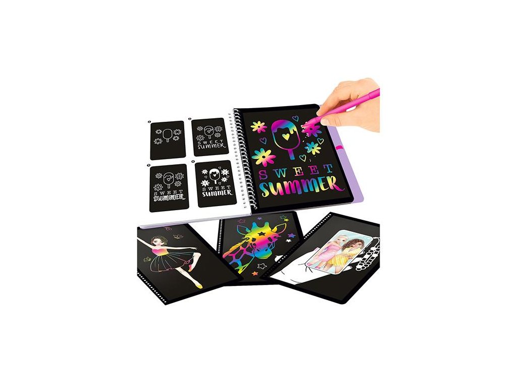 Sešit TOPModel Magic Scratch – Jill je plný kouzelných škrabacích stránek, které děti doslova nadchnou. Na první pohled černé listy v sobě ukrývají duhové, třpytivé nebo barevné motivy, které se objeví jednoduchým seškrabáním pomocí přiloženého dřevěného pera. ✍️