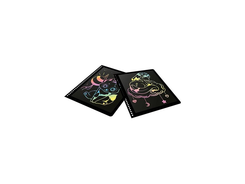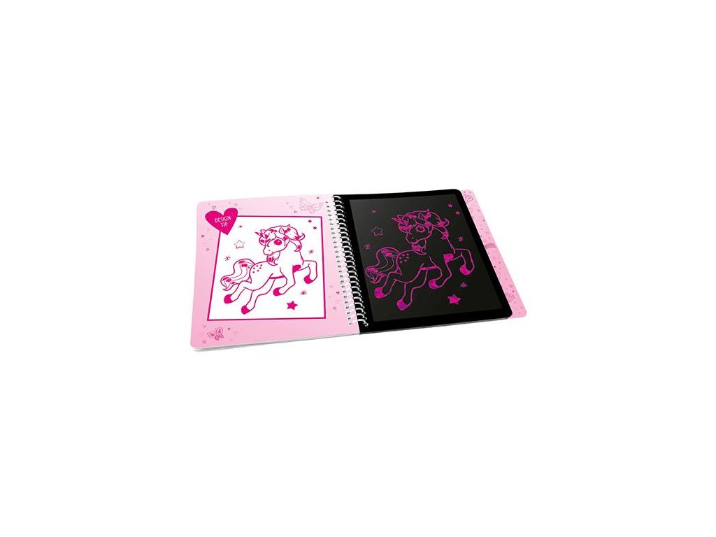 Na první pohled obyčejné černé stránky skrývají kouzelné obrázky plné barev, třpytek a fantazie. Stačí vzít dřevěné pero a začít odhalovat skryté motivy – každým tahem vzniká vlastní umělecké dílo.