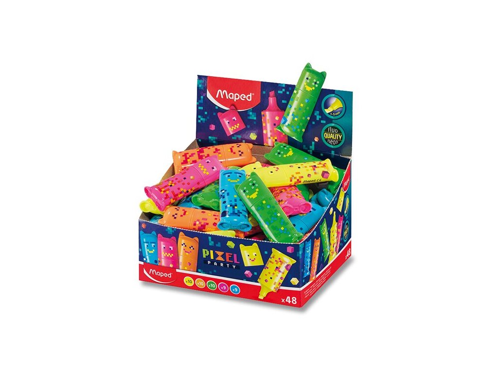 Stojánek 48 ks zvýrazňovače Maped Pixel Party Mini v zářivých barvách. Atraktivní design inspirovaný herními kódy Pixel. Víčko a tělo v barvě inkoustu. Kvalitní a jasný fluorescenční inkoust. Ideální velikost pro školní penál. Odolný proti vysychání a vyblednutí.